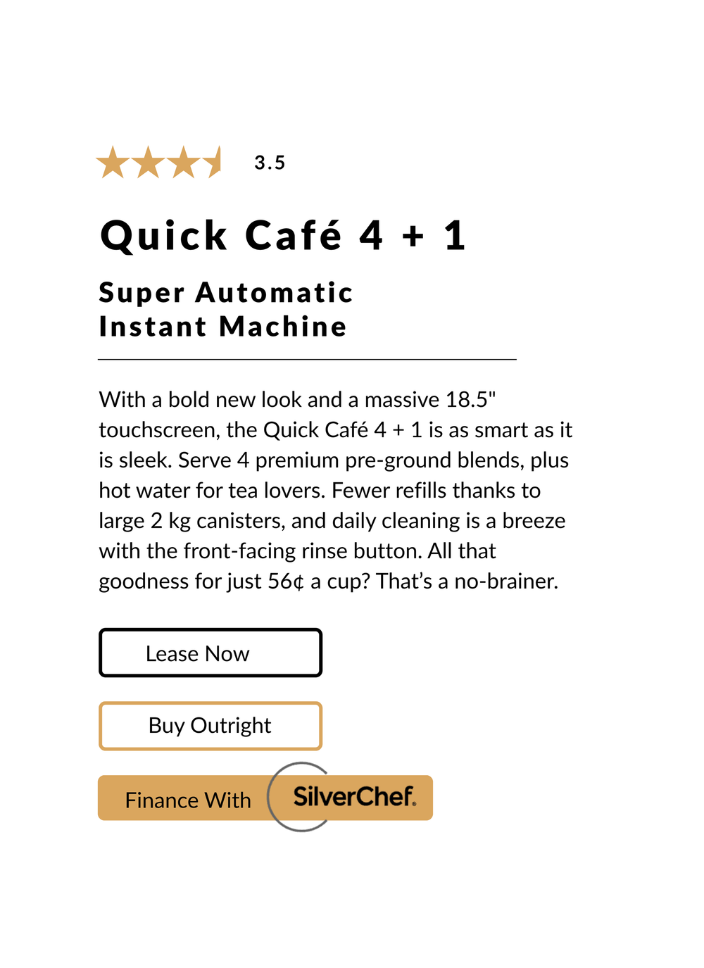 Quick Café 4 + 1 is ideal for fast paced environments such as offices or factories who need a speedy brewing machine. Quick Café 4 + 1 has a daily output of 150 cups. Its extra large canister sizes are ideal for keeping the hot beverages pumping.