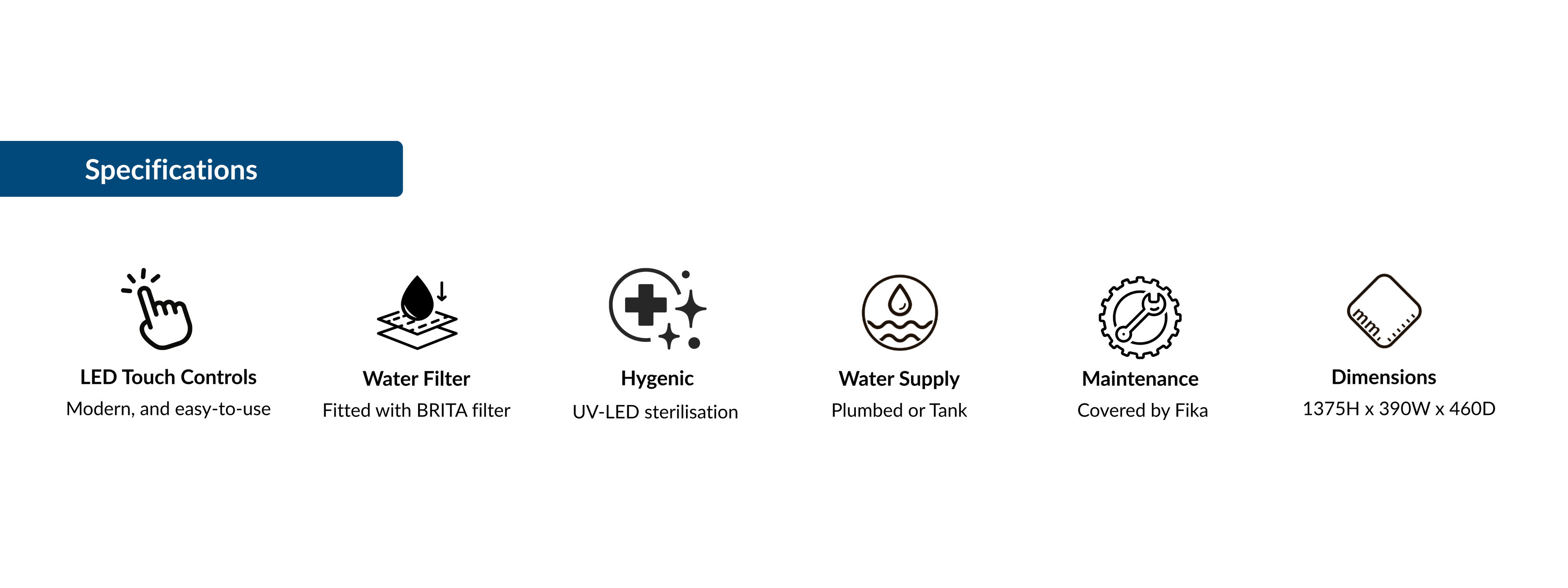 Fika offers a full range of beverage solutions, including sparkling water, hot water, benchtop tap dispensers, and fully automatic coffee machines.